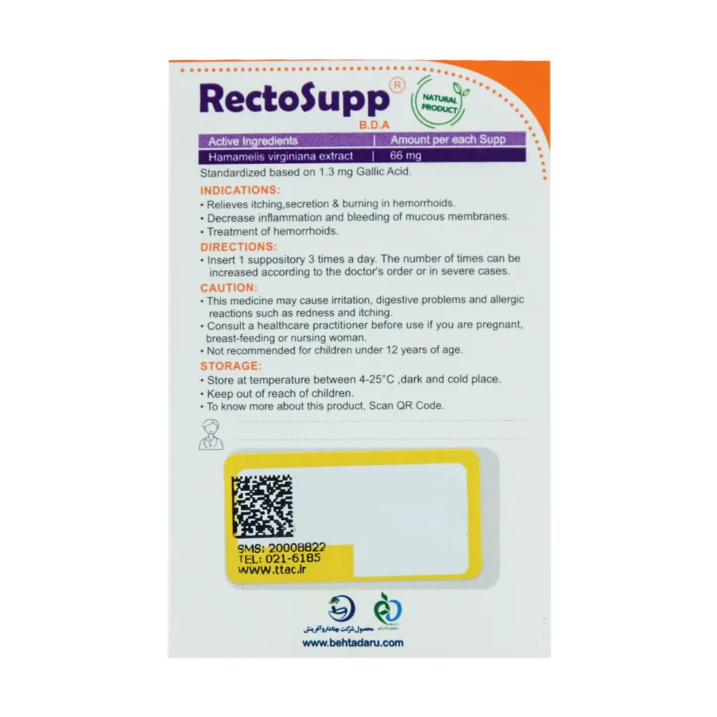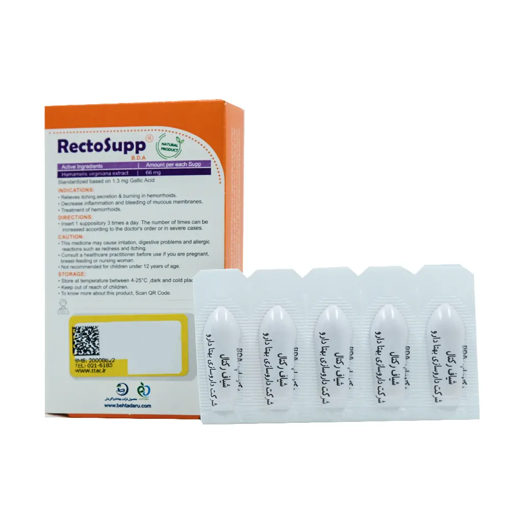 شیاف رکتوساپ بهتا دارو یک داروی کاملا گیاهی و تخصصی برای درمان مشکلات و علائم آنتی هموروئید و بواسیر است. هر شیاف رکتوساپ به میزان 66 میلی گرم عصاره خشک گیاه هاماملیس بوده که بر اساس 1.3 میلی گرم گالیک اسید (ماده موثره این گیاه) استاندارد شده است. گیاه هاماملیس به دلیل داشتن خواص ضد التهابی و ضد باکتریایی در کاهش تورم، خونریزی و التیام بافتهای آسیب دیده موثر است و به درمان بواسیر و هموروئید کمک میکند.