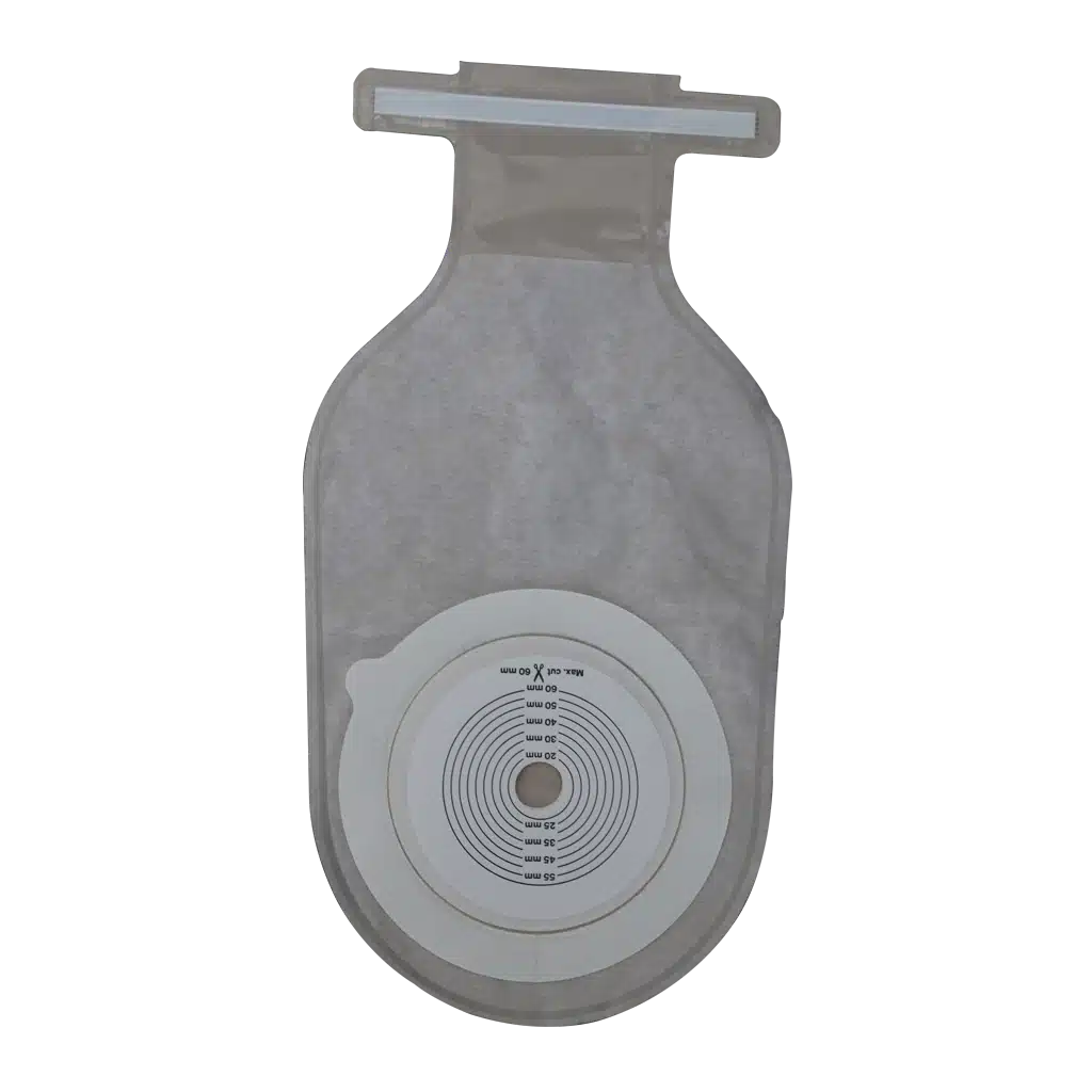 در سیستم یک تکه، کیسه و چسب به طور یکپارچه متصل به هم هستند و قابل جدا شدن از یکدیگر نیستند. سیستم یک تکه در مقایسه با سیستم دو تکه، انعطاف پذیری بیشتر و برجستگی کمتری در زیر لباس دارد. برای استومیت هایی که دچار ورم مفاصل یا مشکل حرکتی در انگشتان هستند، و همچنین افراد کهنسال یا با بینایی کم، شاید استفاده از سیستم یک تکه راحت تر باشد، چون نصب آن مراحل کمتر و ساده تری دارد. همچنین در مواردی که استومیت دارای فتق اطراف استوما (Stoma Hernia) است، معمولا درمانگر استومی استفاده از سیستم یک تکه را به سبب انعطاف پذیری بیشتر و تطابق بهتر با برآمدگی اطراف استوما ترجیح می دهد.