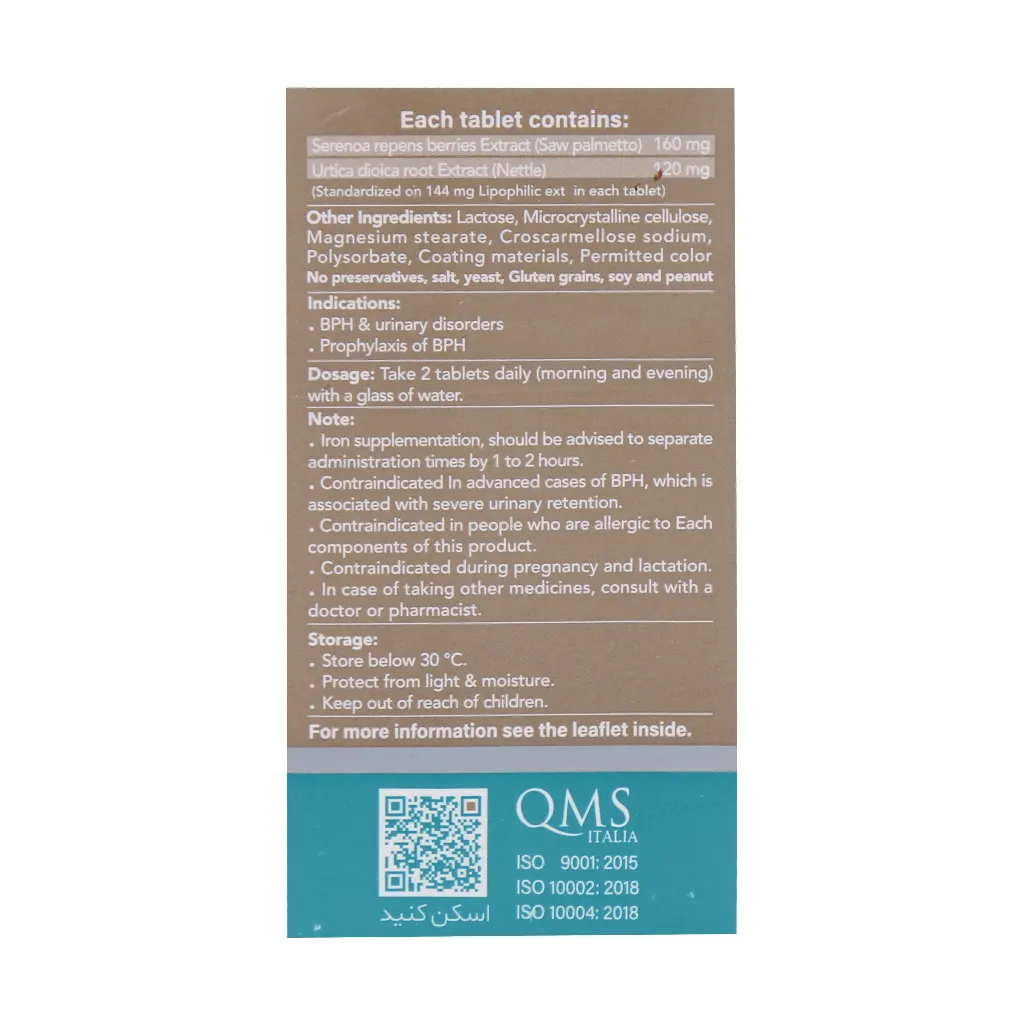 هر قرص حاوی 160 میلی گرم عصاره استاندارد میوه نخل ارهای (Saw palmetto) با 90درصـد مــواد لیپوفیل (شامل اسیدهای چرب و استرولها) و 120 میلی گرم عصاره استاندارد ریشه گزنه (Stinging nettle) است. این قرص بر مبنای 144 میلی گرم عصاره لیپوفیل استاندارد شده است.