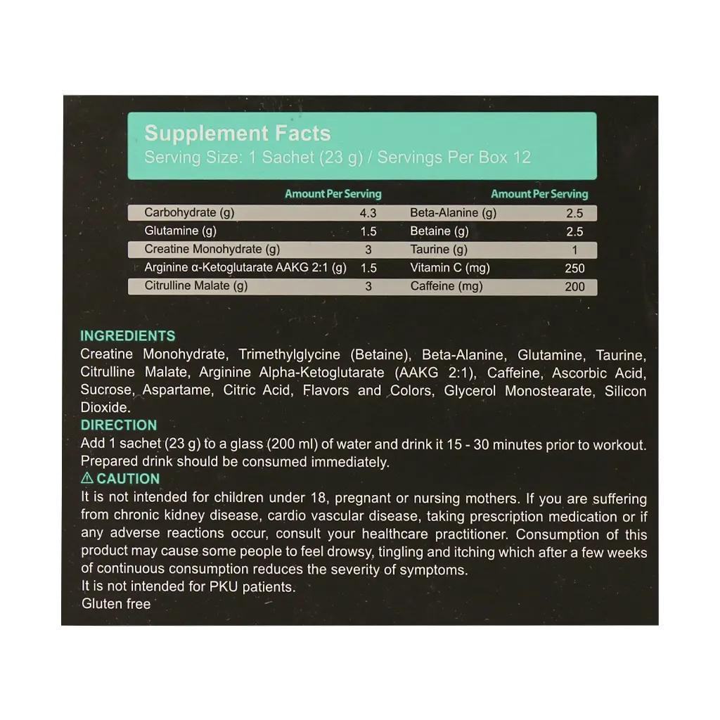 مالتودکسترین، کراتین منوهیدرات، کراتین اتیل استر، تری متیل گلیسین (بتائین)، بتا آلانین، گلوتامین، تورین، سیترولین مالات، آلفا لینولنیک اسید، کافئین، پیکولینات کروم، اسید آسکوربیک، شیرین کننده (سوکرالوز)، اسید سیتریک، طعم دهنده های مجاز خوراکی