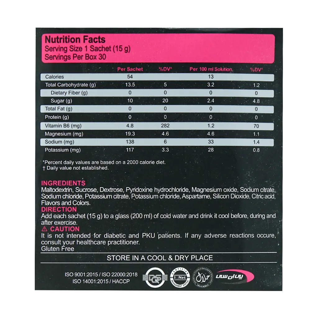 محتوای هر ساشه (15 گرم) را در یک لیوان (200 میلی لیتر) آب حل نموده و محلول آماده شده را قبل، حین و پس از تمرین یا مسابقه خنک بنوشید.
