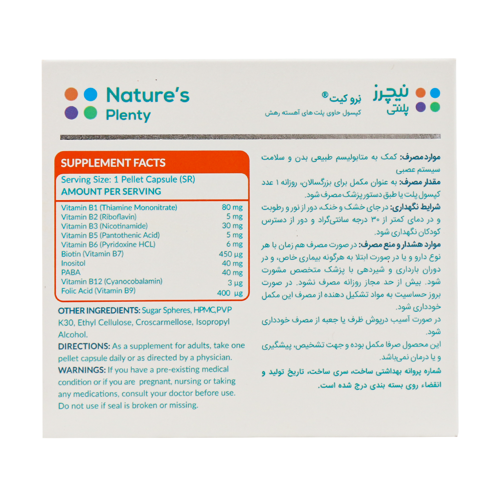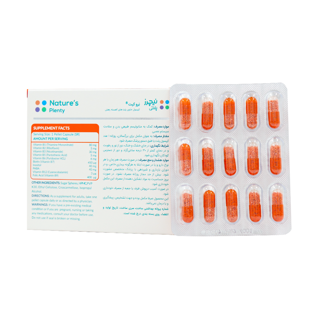 کپسول نرو کیت نیچرز پلنتی حاوی ویتامینهای گروه B به همراه اینوزیتول و پابا جهت سلامت سیستم عصبی استفاده میشود. ویتامینهای گروه ب موجود در این مکمل به روشهای مختلف در عملکرد سیستم عصبی نقش دارند. Neuro Kit نیچرز پلنتی با داشتن ترکیبات ارزشمند خود به متابولیسم طبیعی بدن کمک میکند. این مکمل حاوی پلتهای آهسته رهش بوده، یعنی فرآورده ماده موثره خود را به صورت تدریجی و طی مدت زمان در بدن رها میکند، از این رو با مصرف این قرص، عوارض جانبی خاصی را تجربه نخواهید کرد.