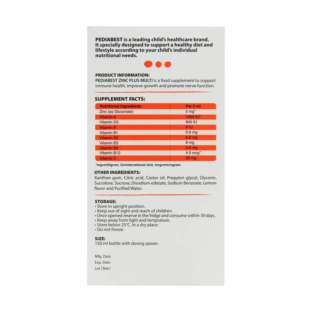 شربت زینک پلاس مولتی پدیابست حاوی مقادیر بالایی از روی و انواع ویتامینهای مورد نیاز برای کودکان است. اطفال بالای 2 سال از این شربت زینک پلاس میتوانند استفاده کنند. این محصول سیستم ایمنی بدن را تقویت نموده و سبب میشود تا کودکان کمتر دچار سرماخوردگی و دیگر بیماریها شوند. این شربت خاصیت آنتی اکسیدانی داشته و به حفظ سلامت بدن کمک میکند. روی یکی از مهمترین املاح معدنی است که کمبود آن در بدن کودکان و بزرگسالان پیامدهای ناگواری را خواهد داشت. استفاده از این شربت افزایش قد کودکان موجب میشود تا کودکان پوست، مو و ناخن سالمتری داشته باشند. در این محصول در کنار روی از بسیاری ویتامینها نیز استفاده شده تا فواید آن افزایش پیدا کند. با خرید زینک پلاس مولتی پدیابست میتوان در راه رشد بهتر کودکان قدمی موثر برداشت. این شربت با طعم لیمو عرضه میشود.