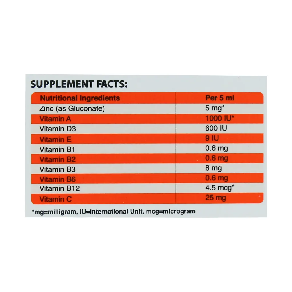 ویتامین A، ویتامین D3، ویتامین E، ویتامین B1، ویتامین B2، ویتامین B3، ویتامین B6، ویتامین B12، ویتامین C، روی گلوکونات، گلیسیرین، سدیم بنزوات، اسید سیتریک، سوکروز، کستر اویل، سدیم ادتا، زانتان گام، سوکرالز، اسانس لیمو و آب خالص