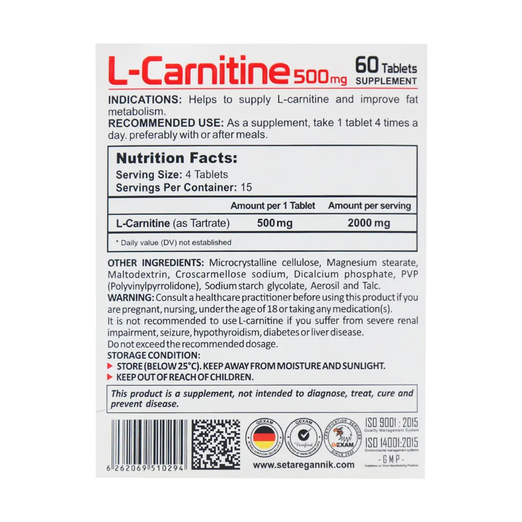 ال کارنیتین تارتارات، میکرو کریستالین سلولز، منیزیم استئارات، مالتودکسترین، کراسکارملوزسدیم، دی کلسیم فسفات، پلی وینیل پیرولیدون، سدیم استارچ گلیکولات، آیروزیل و تالک