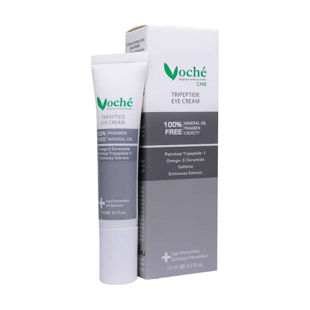 اولین نشانه‌های پیری و افزایش سن در پوست دور چشم دیده می‌شود. تمام حرکات صورت از جمله اخم، خنده و … در ایجاد چین و چروک دور چشم نقش دارند. می‌توان با کنترل این حرکات از افتادن چین و چروک در این نواحی جلوگیری کرد. استفاده از کرم دور چشم از جمله اقداماتی است که از همان سن جوانی سبب می‌شود تا پیری پوست به حداقل رسیده شود. کرم دور چشم وچه مدل Tripeptide یک محصول فوق العاده حاوی کافئین، روغن آووکادو، سرامید و امگا 3 است.